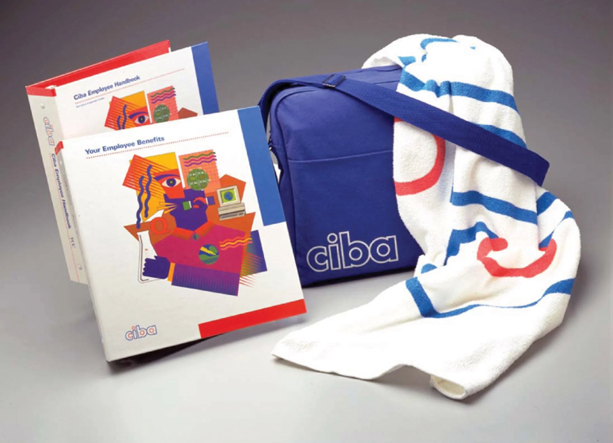 Pure corporate design of Ciba handbooks using a grid, adhered to Ciba Visual Identity System. Ciba Handbooks and a towel silkscreened with the Ciba-Geigy logo were all packaged in a silkscreened flight bag employees took on business trips.