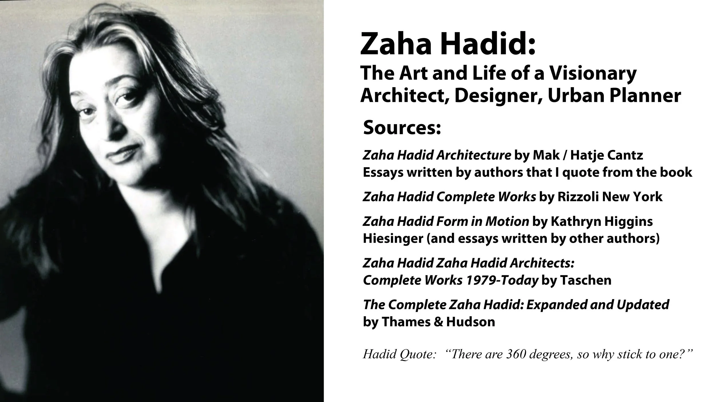 Zaha Hadid was a revolutionary British-Iraqi architect, artist, and designer. Her designs have been described as “planetary.” In this lecture, we will delve into such signature projects as the Aquatics Centre for the 2012 London Olympics, the Broad Art Museum, Rome’s MAXXI Museum, the Guangzhou Opera House and the Vitra Fire Station. We will also go inside the VITRA Museum and see examples of Hadid’s iconic objects, furniture, and interiors.