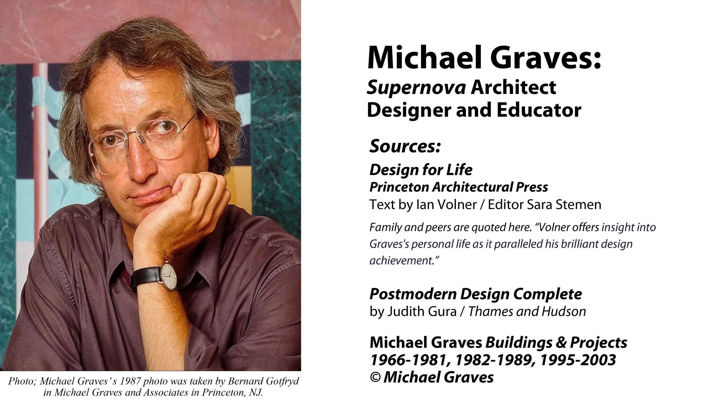 Michael Graves was “one of the most prominent and prolific designers and architects of the late twentieth century.” Graves is widely known for his popular and whimsical product designs, like the world-famous Alessi whistling bird teakettle. He has designed many controversial buildings, such as Portland Public Service Building in Portland, Oregon, the Humana Building in Louisville, Kentucky, and the Dolphin and Swan Hotels at Walt Disney World in Florida. In my lecture, I touch on what inspired Graves growing up and how his experiences helped shape and influenced him into what he became: a Supernova architect, designer, and educator.
