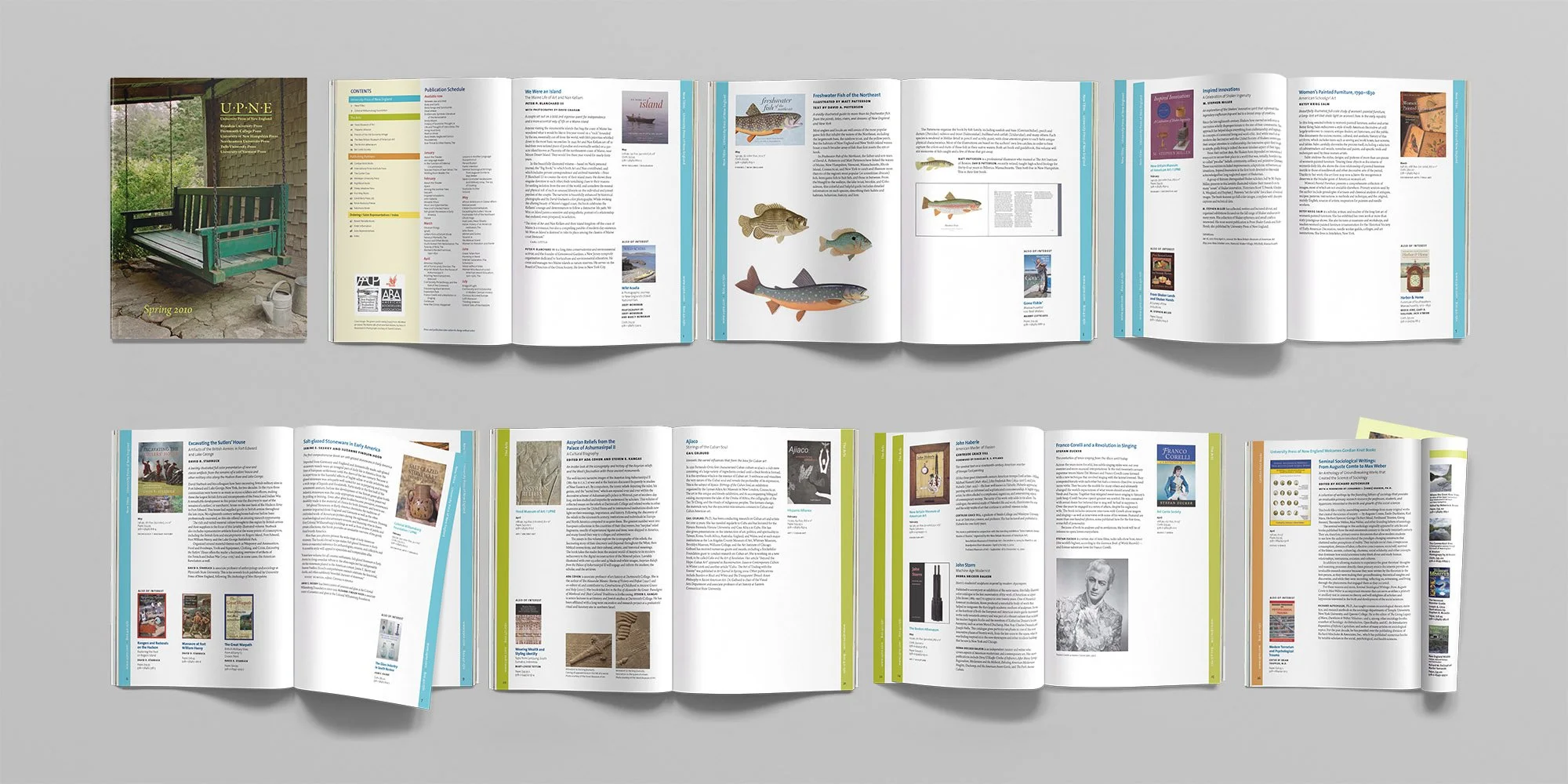 University Press of New England (UPNE) was Dartmouth College’s scholarly, independent press and a publishing consortium. I collaborated with UPNE marketing and sales colleagues, six UPNE member presses, 14 UPNE publishing partners, as well as authors to design a wide variety of print and web sales tools. These include direct mail, themed series brochures, ads, flyers, signage and point-of-purchase displays, web banners, display ads and landing pages and in-house UPNE Seasonal catalogs.